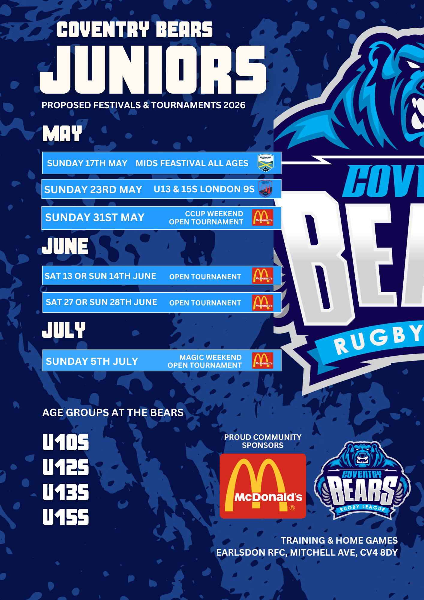 Coventry Bears Rugby League Club are looking to host a series of junior tournaments sponsored by Coventry McDonalds Restaurants during the 2026 summer season.